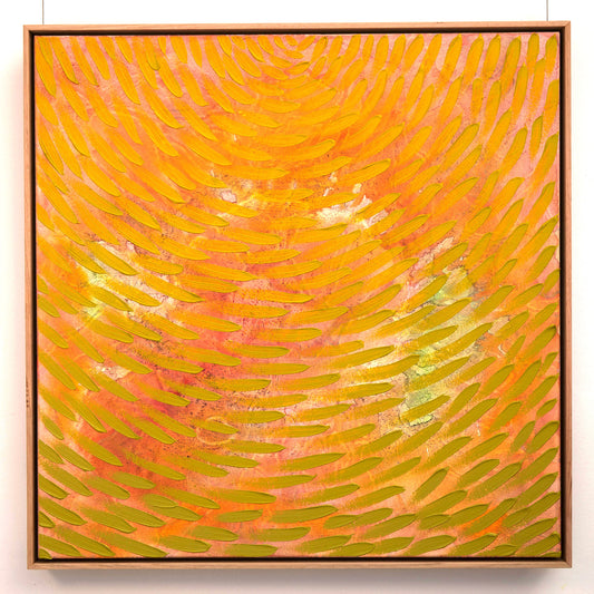 Growing up in Finland I didn’t see plants in flower most of the year so I imagined what they would look like. This series of works is playing with that notion of emerging water and my imaginational flowers. I start working with the back ground and slowly build up the layers until I paint the flowers last.